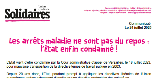Depuis de nombreuses années, la CGT, Force ouvrière et l’Union syndicale Solidaires, se battent devant les tribunaux français pour contraindre l’Etat à appliquer cette directive qui apporterait des droits nouveaux importants aux salarié-es en arrêt maladie et permettrait d’en finir avec la double peine.