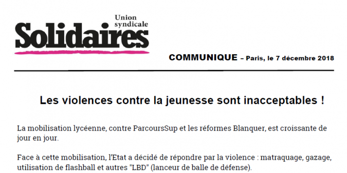 Solidaires est aux côté des lycéennes et lycéens qui se mobilisent et soutient également la mobilisation croissante dans les universités, en particulier contre la hausse des frais d’inscription pour les étrangères et étrangers.
