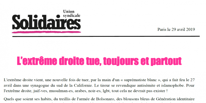 L'extrême droite vient, une nouvelle fois de tuer, par la main d'un « suprématiste blanc », qui a fait feu le 27 avril dans une synagogue du sud de la Californie. Le tireur se revendique antisémite et islamophobe. Pour l'extrême droite, juif-ves, musulman-es, arabes, noir-es, lgbt, tout cela ne devrait pas exister ! Quels que soient ses habits, du treillis de l'armée de Bolsonaro, des blousons bleus de Génération identitaire ou des costumes-cravates des cadres du Rassemblement national, l'extrême droite reste la même ! C'est le poison de la haine ! Ce poison qui gagne du terrain dans les élections, hier en France, aujourd’hui en Espagne… C’est pourquoi l'Union syndicale Solidaires poursuit, chaque jour, son combat contre la diffusion des idées d'extrême droite et de la reprise de ses thèses par une frange de plus en plus large de la classe politique, y compris à la tête de l'Etat.