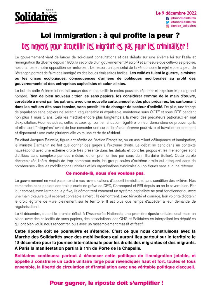 Cette riposte doit se poursuivre et s'étendre. C’est ce que nous construisons avec la Marche des Solidarités avec des mobilisations qui auront lieu partout sur le territoire le 18 décembre pour la journée internationale pour les droits des migrantes et des migrants. A Paris la manifestation partira à 11h de Porte de la Chapelle.