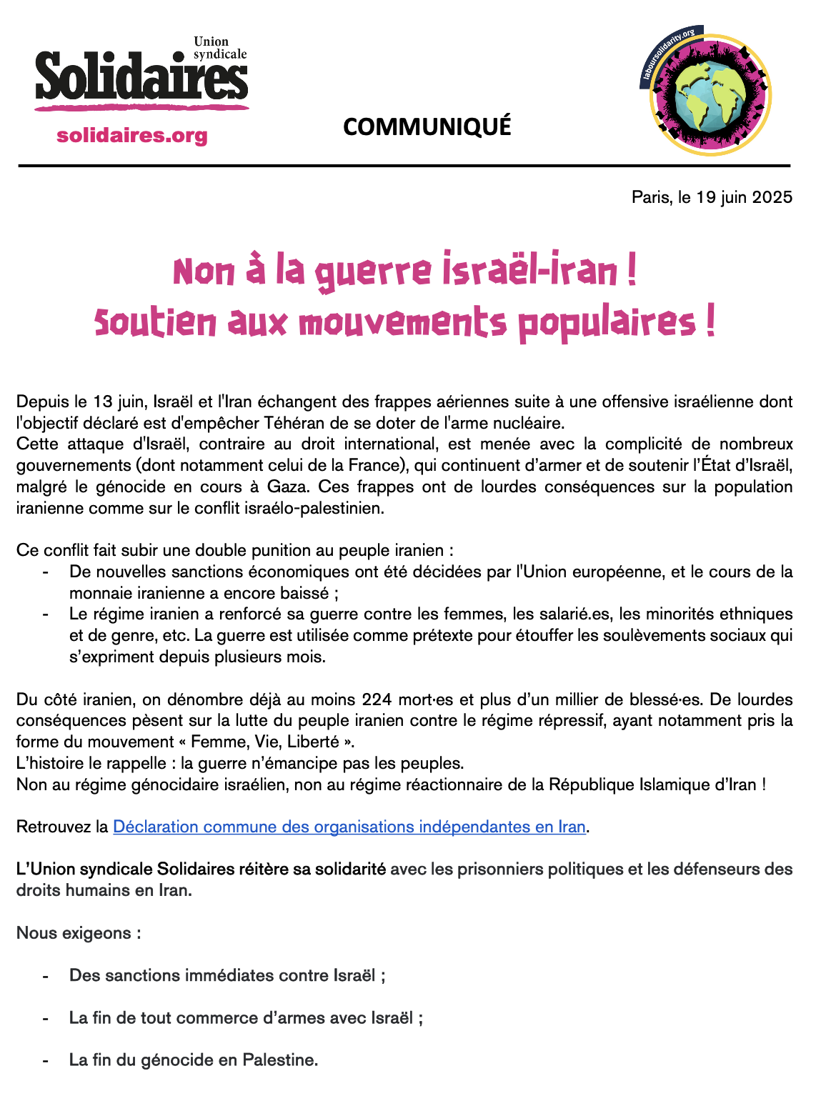 L’Union syndicale Solidaires réitère sa solidarité avec les prisonniers politiques et les défenseurs des droits humains en Iran.