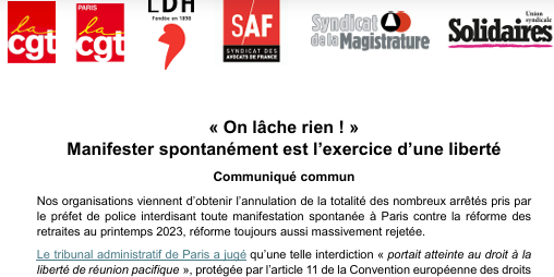 Nos organisations viennent d’obtenir l’annulation de la totalité des nombreux arrêtés pris par le préfet de police interdisant toute manifestation spontanée à Paris contre la réforme des retraites au printemps 2023, réforme toujours aussi massivement rejetée.