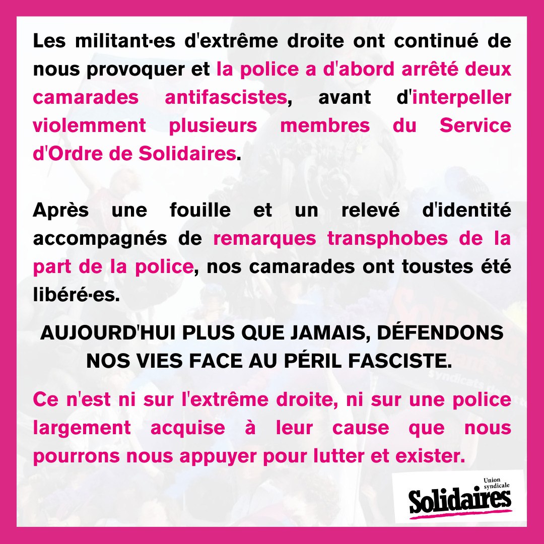 Après une fouille et un relevé d'identité accompagnés de remarques transphobes de la part de la police, nos camarades ont toustes été libéré×es.