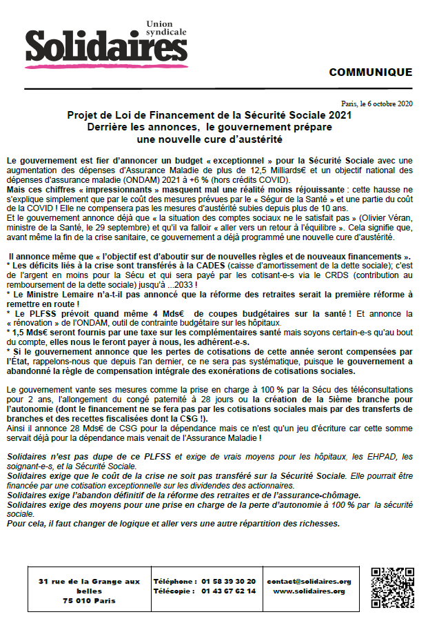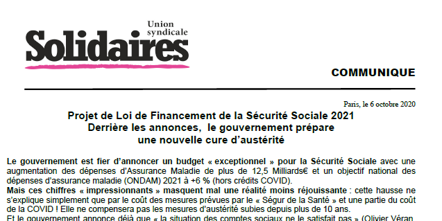 Solidaires exige que le coût de la crise ne soit pas transféré sur la Sécurité Sociale.