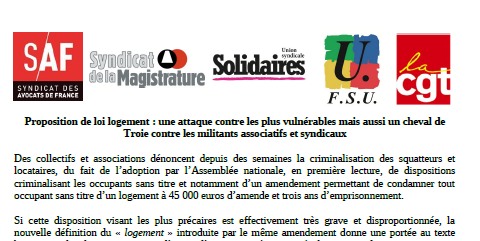 Le SAF, le Syndicat de la Magistrature, l’Union syndicale Solidaires, la FSU, la CGT alertent donc les sénateurs sur cet article, et les invitent à déposer des amendements pour faire retirer cette disposition, ajoutée à la dernière minute et qui s’apparente plus à un cavalier législatif répressif qu’à une disposition protégeant les propriétaires.