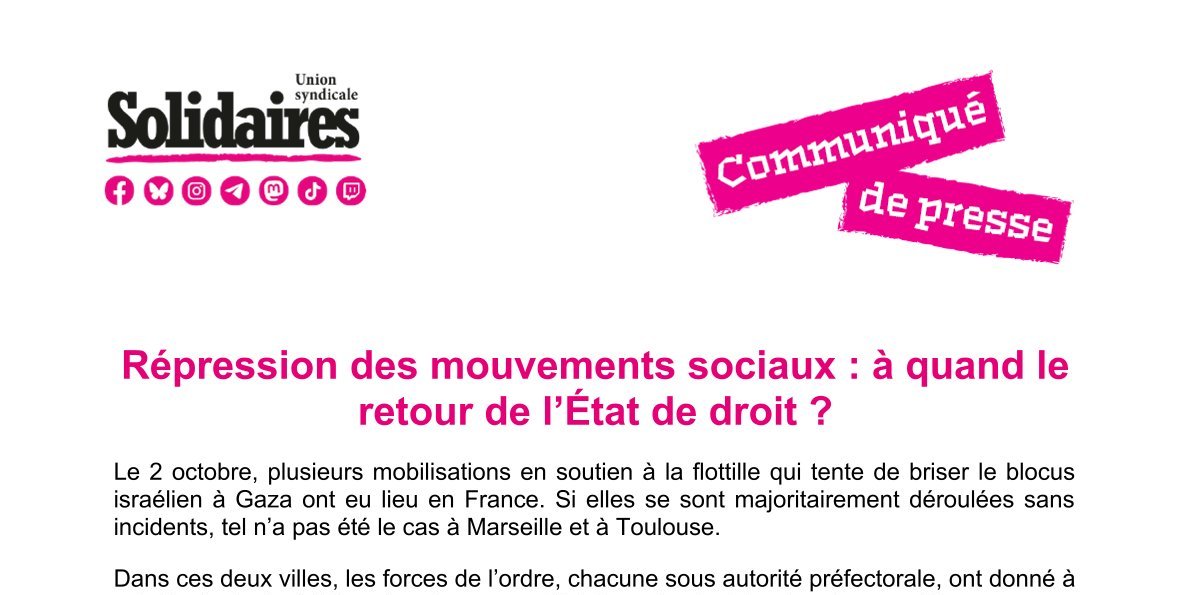 L’Union syndicale Solidaires dénonce ces pratiques qui cherchent à décourager l’expression du soutien au peuple palestinien. Elle condamne fermement ces actes qui démontrent bien que la violence illégitime habite le camp du pouvoir. Elle exprime son soutien aux victimes de cette répression aveugle et hors de tout propos. Manifester ne constitue pas un crime et encore moins quand il s’agit d’exiger un cessez-le-feu et la fin d’un génocide et du blocus qui affame une population. Hier comme aujourd’hui, la répression policière des mouvements sociaux n’est pas acceptable et doit cesser immédiatement. Et celles et ceux qui se prêtent à (et couvrent) de telles méthodes doivent être poursuivi·es et condamné·es pour leurs actes.
