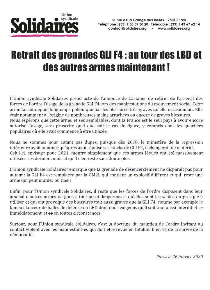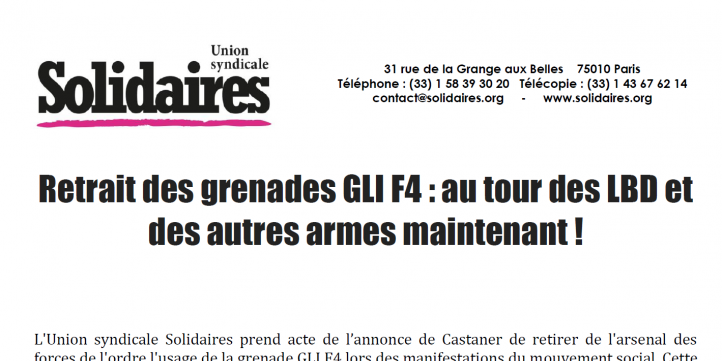 L'Union syndicale Solidaires prend acte de l’annonce de Castaner de retirer de l'arsenal des forces de l'ordre l'usage de la grenade GLI F4 lors des manifestations du mouvement social. Cette arme faisait depuis longtemps polémique par les blessures très graves qu'elle occasionnait. Elle était notamment à l'origine de nombreuses mains arrachées ou encore de graves blessures.