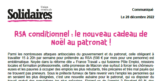 Cette réforme s’annonce bien comme une des mesures les plus détestables de la Macronie dont le marqueur économique est toujours plus libéral. A l’instar de la mobilisation des travailleurs/ses sociaux/ales en Ardèche, le mouvement social doit s’opposer fortement à cette vilenie antisociale et ce quasi retour à l’esclavage. RSA conditionnel, réforme de l’assurance chômage, loi antisquat et contre les locataires défaillants, loi immigration et réforme des retraites, c’est une attaque totale que mène l’Etat et le MEDEF contre nos droits sociaux.