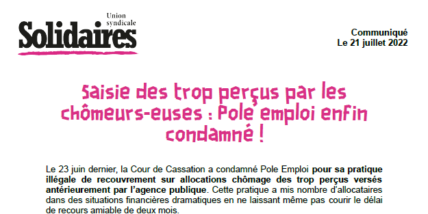 L’Union syndicale Solidaires se félicite de cette victoire contre l’impunité dans laquelle s’imaginait être Pole Emploi dans l’exercice d’une pratique scandaleuse à l’encontre des plus fragiles des travailleurs-euses chômeurs-euses pour qui la perte non anticipée de quelques euros peut signifier la déchéance.
