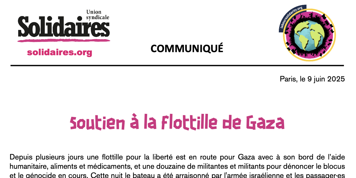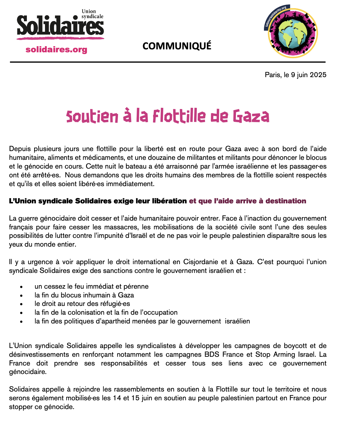 Solidaires appelle à rejoindre les rassemblements en soutien à la Flottille sur tout le territoire et nous serons également mobilisé·es les 14 et 15 juin en soutien au peuple palestinien partout en France pour stopper ce génocide.