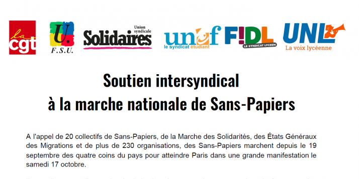 A l'appel de 20 collectifs de Sans-Papiers, de la Marche des Solidarités, des États Généraux des Migrations et de plus de 230 organisations, des Sans-Papiers marchent depuis le 19 septembre des quatre coins du pays pour atteindre Paris dans une grande manifestation le samedi 17 octobre.