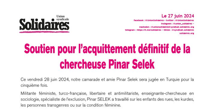 Devant la situation aussi intolérable qu’injuste qu’elle vit depuis de trop nombreuses années, Solidaires réaffirme son soutien à Pinar Selek et appelle les autorités françaises à s’assurer de sa sécurité et à intervenir auprès du pouvoir turc pour que cesse cet acharnement judiciaire.