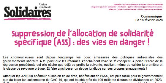 Attaquer les 320 000 chômeur·euses en fin de droit, bénéficiant de l'ASS, est plus facile pour le gouvernement que de taxer les actionnaires du CAC 40, qui ont touché près de 100 milliards d'euros de dividendes en 2023. Cette stratégie gouvernementale vise à accentuer la division entre travailleur·euses en emploi et les autres : pas d'augmentation de salaires pour les premiers, on diminue les revenus des seconds, les stigmatisant et risquant de les faire basculer sous le seuil de pauvreté.