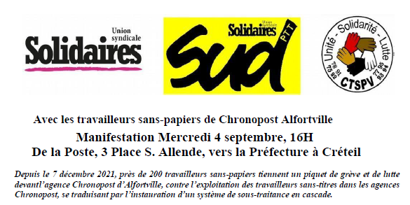 Manifestation le mercredi 4 septembre, 16H De la Poste, 3 Place S. Allende, vers la Préfecture à Créteil
