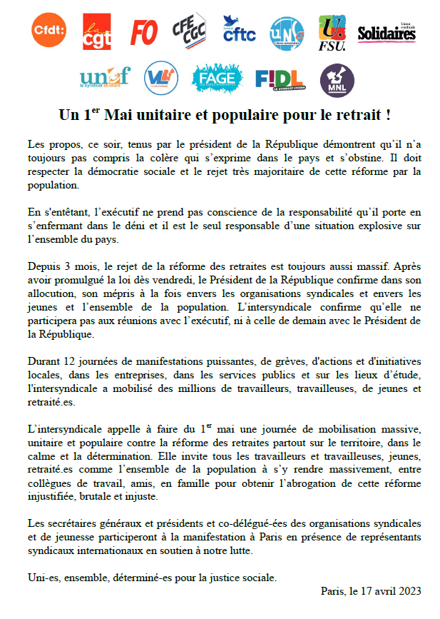 L’intersyndicale appelle à faire du 1er mai une journée de mobilisation massive, unitaire et populaire contre la réforme des retraites partout sur le territoire, dans le calme et la détermination. Elle invite tous les travailleurs et travailleuses, jeunes, retraité.es comme l’ensemble de la population à s’y rendre massivement, entre collègues de travail, amis, en famille pour obtenir l’abrogation de cette réforme injustifiée, brutale et injuste.