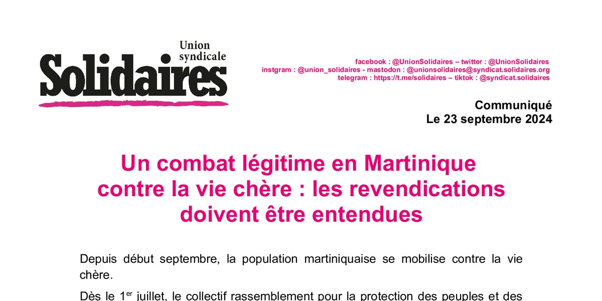L’Union syndicale Solidaires apporte tout son soutien à la population de Martinique et de Guadeloupe dans le combat qu’elles mènent.