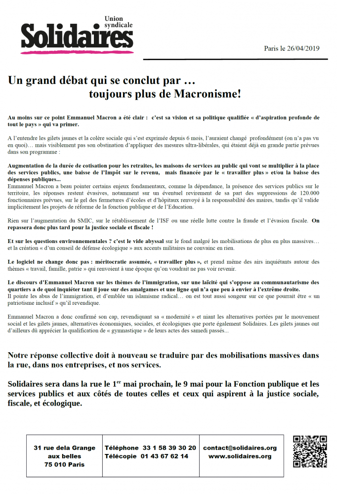 Emmanuel Macron a donc confirmé son cap, revendiquant sa « modernité » et niant les alternatives portées par le mouvement social et les gilets jaunes, alternatives économiques, sociales, et écologiques que porte également Solidaires. Les gilets jaunes ont d’ailleurs dû apprécier la qualification de « gymnastique » de leurs actes des samedi passés...
