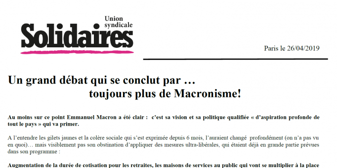 Emmanuel Macron a donc confirmé son cap, revendiquant sa « modernité » et niant les alternatives portées par le mouvement social et les gilets jaunes, alternatives économiques, sociales, et écologiques que porte également Solidaires. Les gilets jaunes ont d’ailleurs dû apprécier la qualification de « gymnastique » de leurs actes des samedi passés...