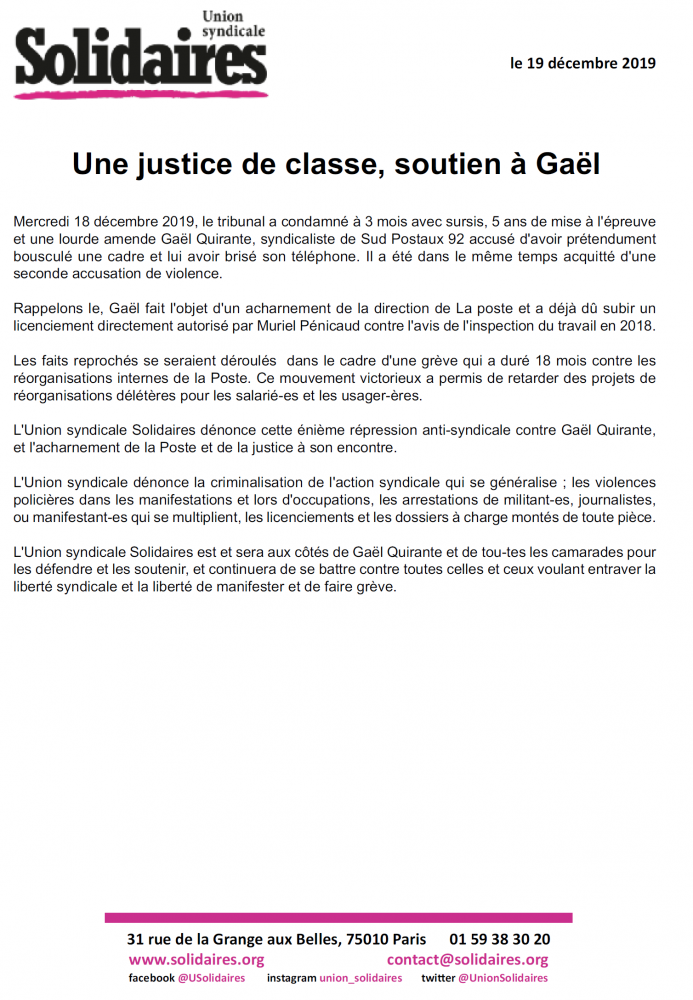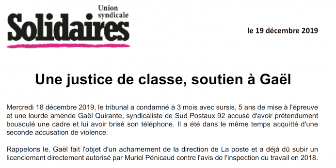 Mercredi 18 décembre 2019, le tribunal a condamné à 3 mois avec sursis, 5 ans de mise à l'épreuve et une lourde amende Gaël Quirante, syndicaliste de Sud Postaux 92 accusé d'avoir prétendument bousculé une cadre et lui avoir brisé son téléphone. Il a été dans le même temps acquitté d'une seconde accusation de violence.