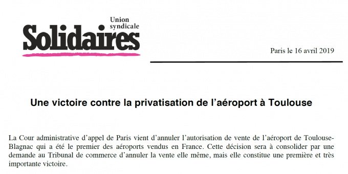 La Cour administrative d’appel de Paris vient d’annuler l’autorisation de vente de l’aéroport de Toulouse-Blagnac qui a été le premier des aéroports vendus en France. Cette décision sera à consolider par une demande au Tribunal de commerce d’annuler la vente elle même, mais elle constitue une première et très importante victoire.