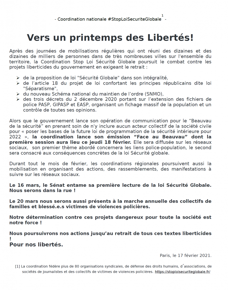 En complément, émission « Face au Beauveau », jeudi 18 février, à 20 h 30 - l'émission de la Coordination nationale #StoploiSécuritéGlobale.
