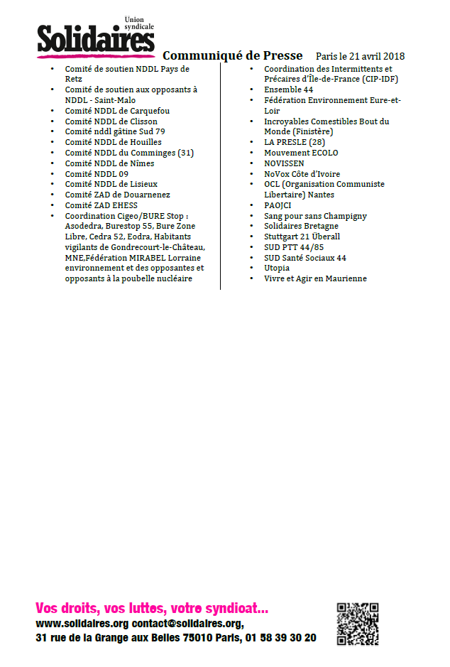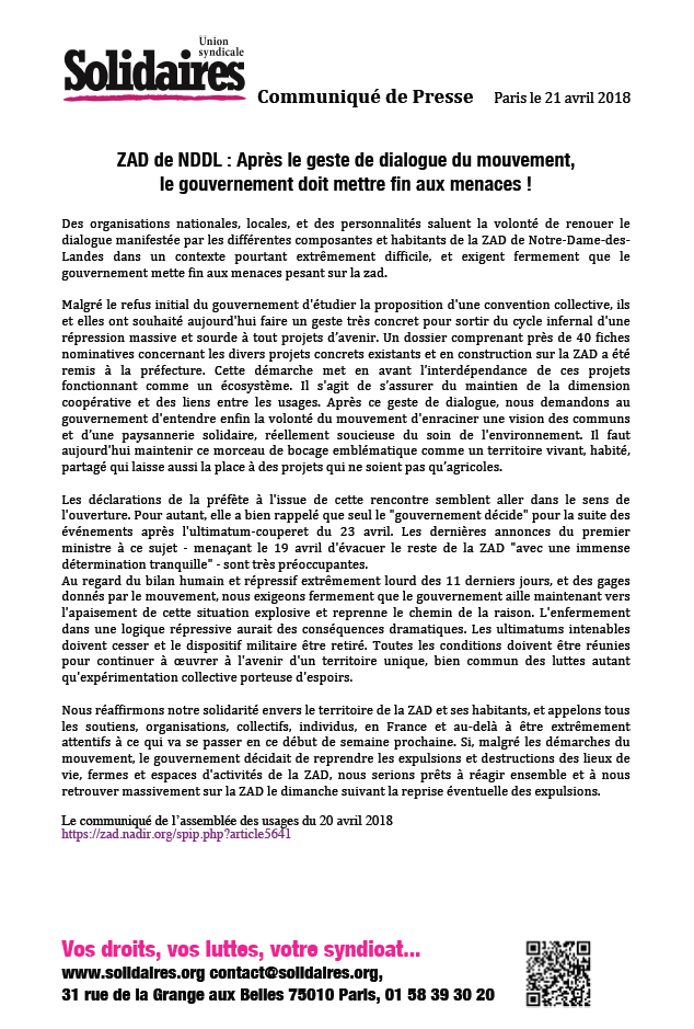 Le communiqué de l’assemblée des usages du 20 avril 2018 : https://zad.nadir.org/spip.php?article5641