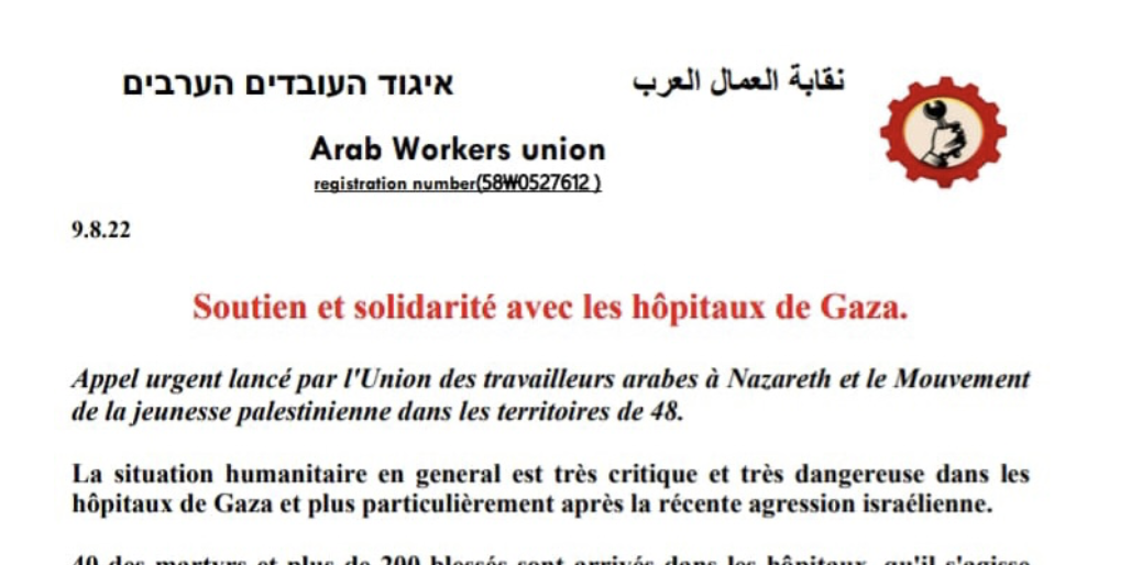 Communiqué du syndicat palestinien Arab workers Union : Soutien et solidarité avec les hôpitaux de Gaza