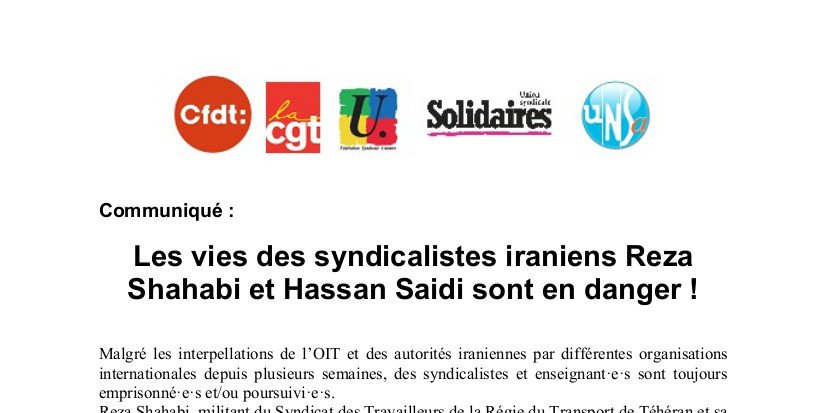 Communiqué intersyndical : Les vies des syndicalistes iraniens Reza Shahabi et Hassan Saidi sont en danger !
