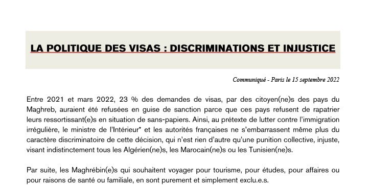 Ainsi, au prétexte de lutter contre l’immigration irrégulière, le ministre de l’Intérieur* et les autorités françaises ne s’embarrassent même plus du caractère discriminatoire de cette décision, qui n’est rien d’autre qu’une punition collective, injuste, visant indistinctement tous les Algérien(ne)s, les Marocain(ne)s ou les Tunisien(ne)s.
