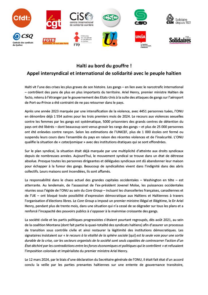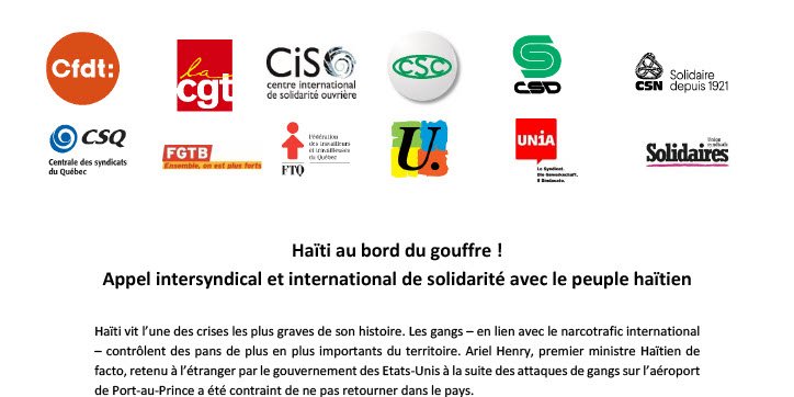 Nos organisations syndicales, issues de la francophonie de Belgique, de France, de Suisse et du Québec, profondément préoccupées par le cours des évènements et déterminées à appuyer les syndicats haïtiens, les travailleuses et travailleurs et plus généralement la population haïtienne dans leur volonté d’aboutir à une transition ne répétant pas les erreurs du passé, ont décidé de se concerter pour :