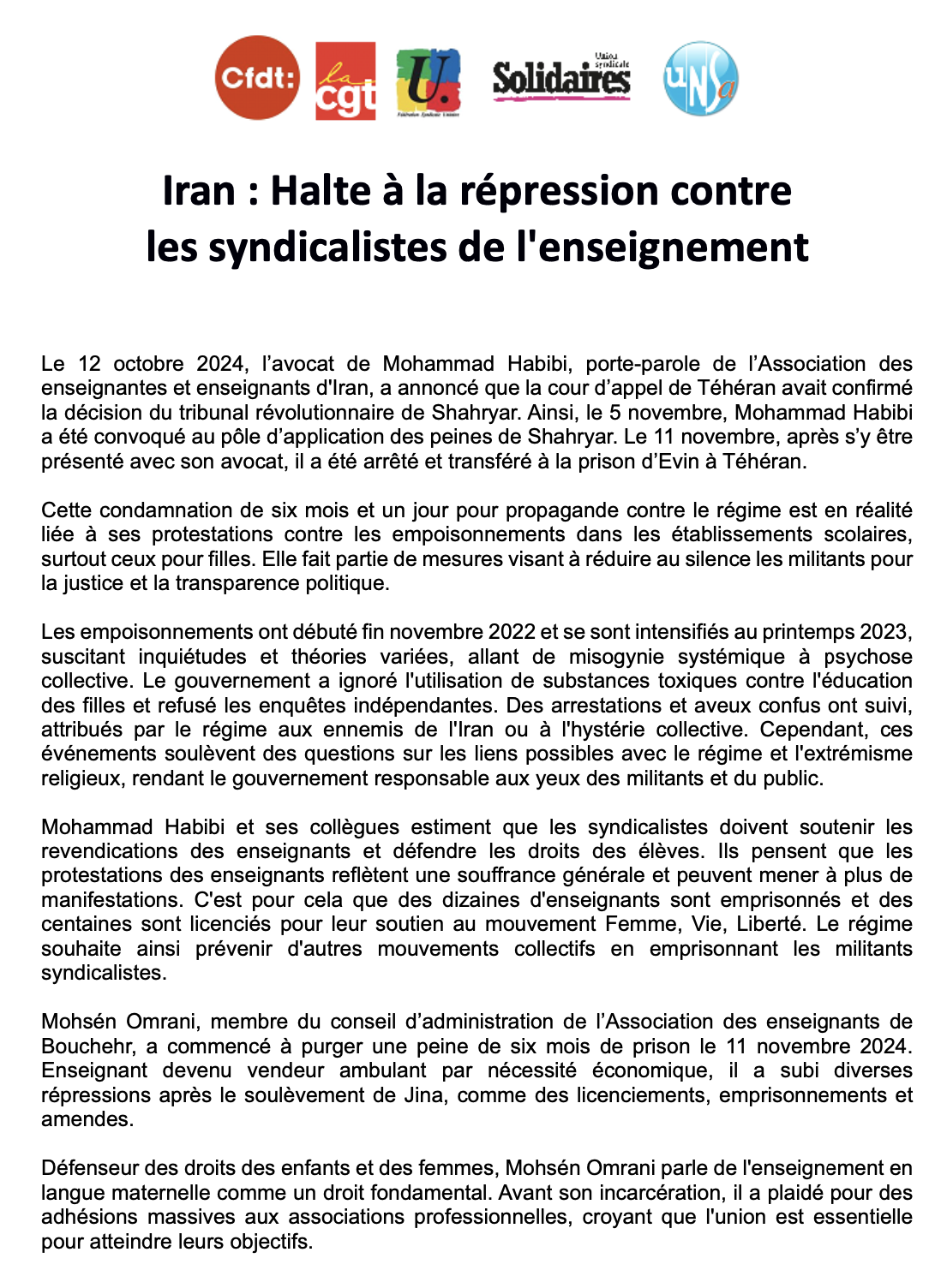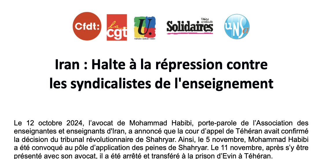 Libération immédiate des syndicalistes et prisonnie.res d'opinion en Iran !