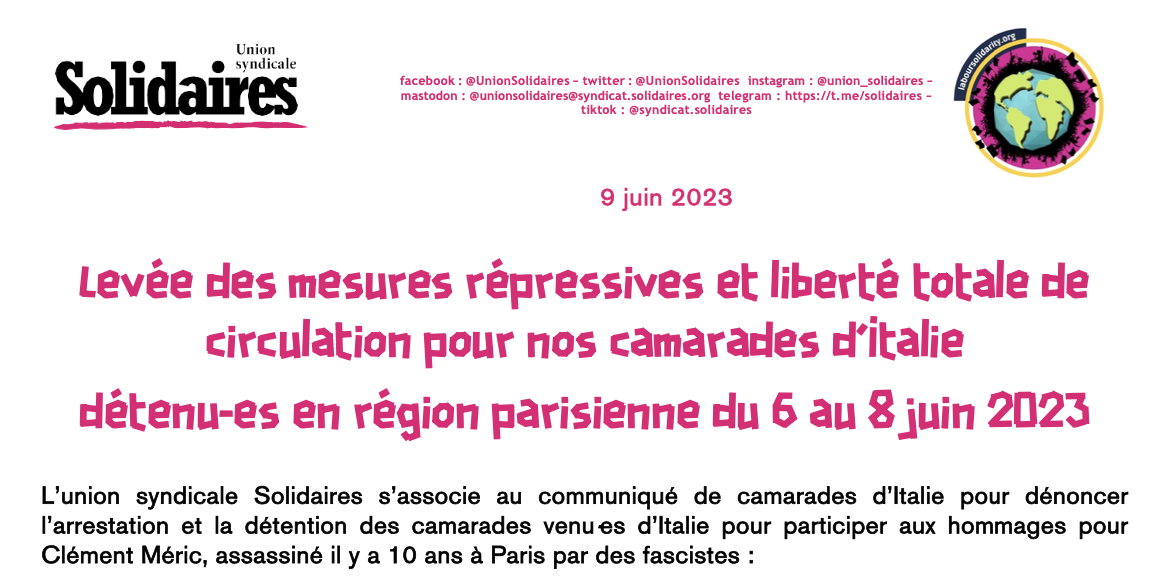 L’union syndicale Solidaires s’associe au communiqué de camarades d’Italie pour dénoncer l’arrestation et la détention des camarades venu·es d’Italie pour participer aux hommages pour Clément Méric, assassiné il y a 10 ans à Paris par des fascistes :