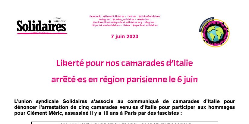 L’union syndicale Solidaires s’associe au communiqué de camarades d’Italie pour dénoncer l’arrestation de cinq camarades venu·es d’Italie pour participer aux hommages pour Clément Méric, assassiné il y a 10 ans à Paris par des fascistes :