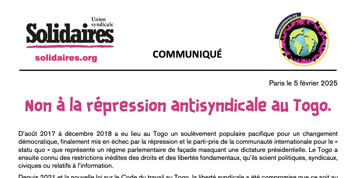 L’Union syndicale Solidaires appelle donc une nouvelle fois et plus que jamais les autorités du Togo :