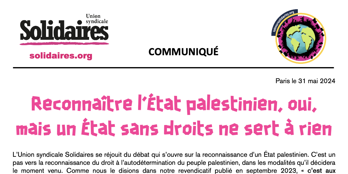 L’Union syndicale Solidaires se réjouit du débat qui s’ouvre sur la reconnaissance d’un État palestinien. C’est un pas vers la reconnaissance du droit à l’autodétermination du peuple palestinien, dans les modalités qu’il décidera le moment venu. Comme nous le disions dans notre revendicatif publié en septembre 2023, « c’est aux Palestiniens et Palestiniennes de décider si leurs exigences et revendications doivent toujours déboucher sur une revendication étatique, et quelle devrait être sa formulation.(1) » Ce constat résultait du rejet de plus en plus fort de la solution à deux Etats proposée dans le cadre du « processus d’Oslo », rejet que nous avions constaté sur place, tant la situation était dégradée du fait de l’approfondissement de la colonisation et des mesures de blocus à Gaza et ce, bien avant le 7 octobre.