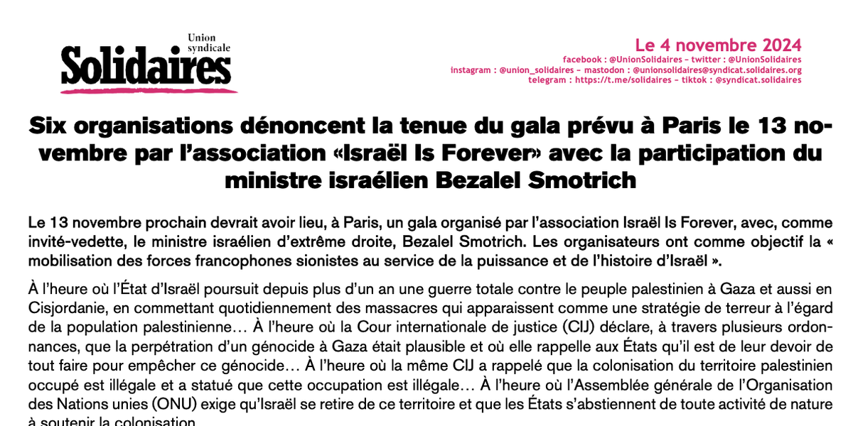 Le 13 novembre prochain devrait avoir lieu, à Paris, un gala organisé par l’association Israël Is Forever, avec, comme invité-vedette, le ministre israélien d’extrême droite, Bezalel Smotrich. Les organisateurs ont comme objectif la « mobilisation des forces francophones sionistes au service de la puissance et de l’histoire d’Israël ».