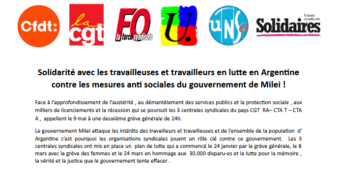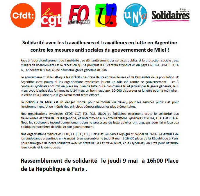 Nos organisations syndicales CFDT, CGT, FO, FSU, UNSA et Solidaires rejoignent l’appel de l’ACAF (Asamblea de los ciudadanos argentinos en Francia) à se rassembler le jeudi 9 mai à 16h00 place de la République à Paris pour témoigner de notre solidarité avec les travailleuses et travailleurs, et les syndicats, en lutte pour défendre leurs droits et la démocratie.