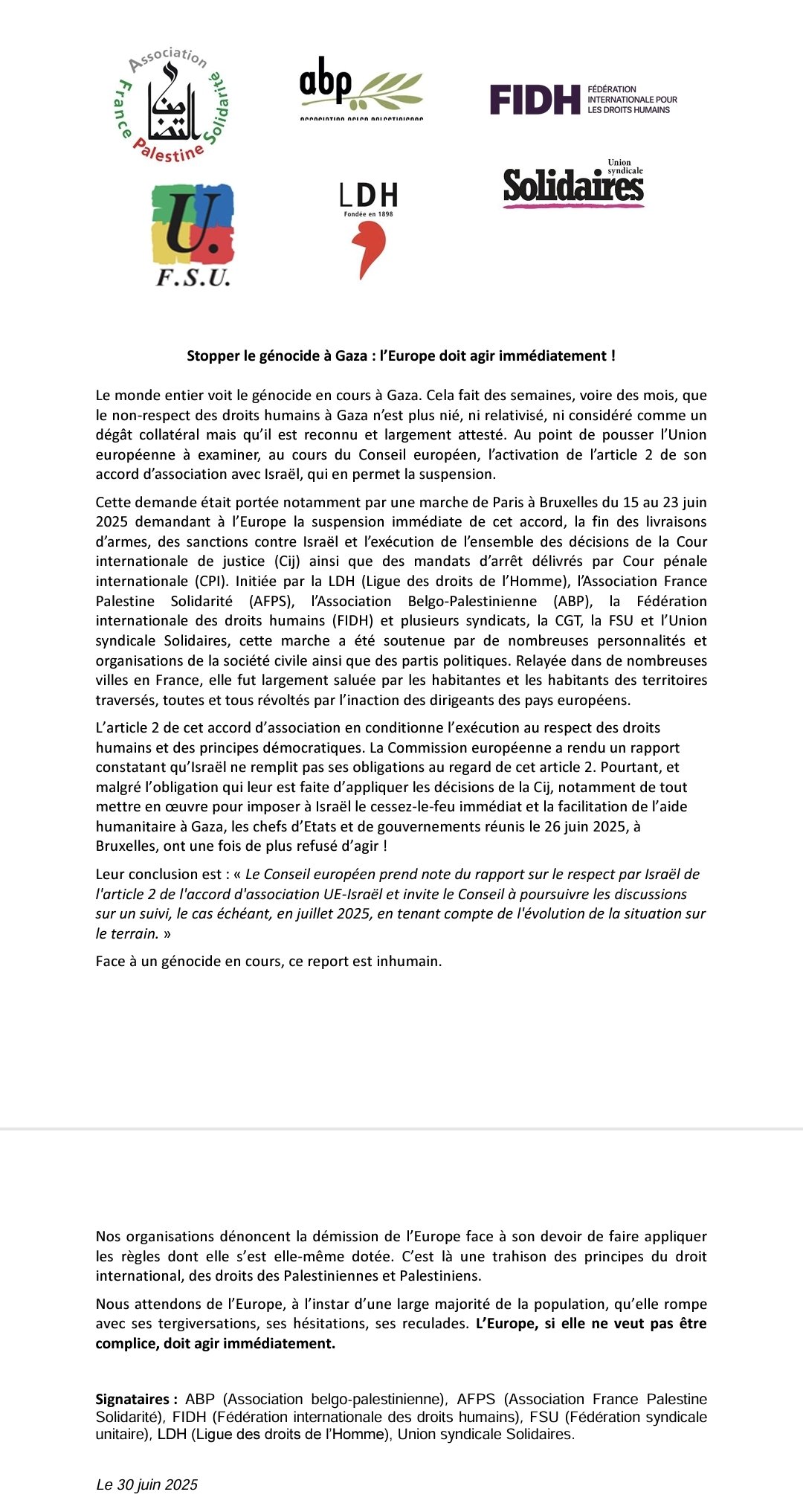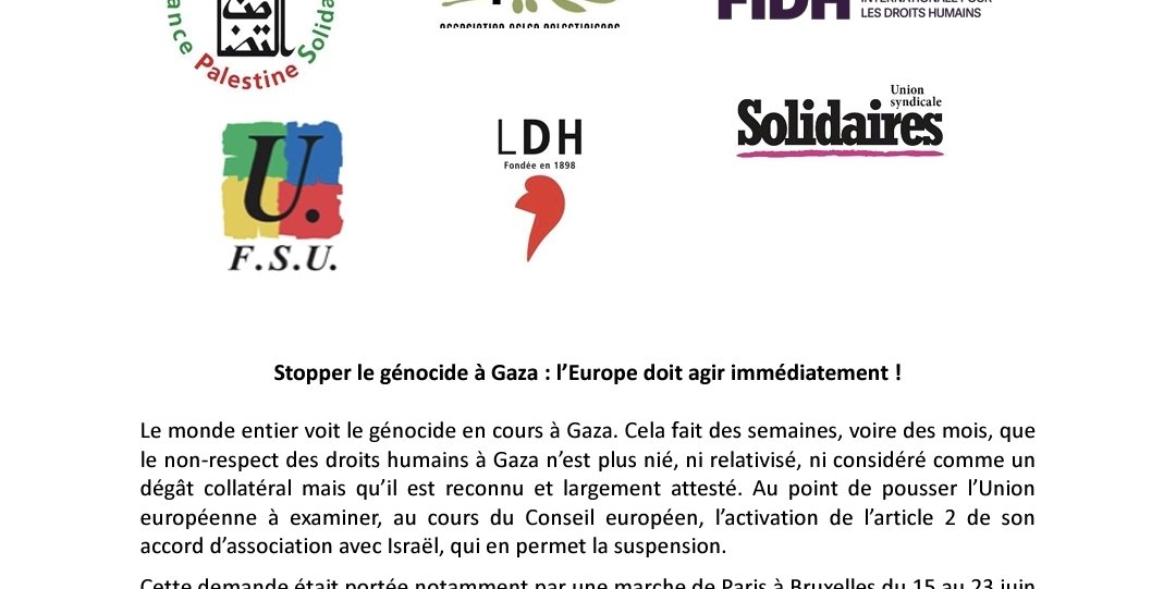 Cette demande était portée notamment par une marche de Paris à Bruxelles du 15 au 23 juin 2025 demandant à l’Europe la suspension immédiate de cet accord, la fin des livraisons d’armes, des sanctions contre Israël et l’exécution de l’ensemble des décisions de la Cour internationale de justice (Cij) ainsi que des mandats d’arrêt délivrés par Cour pénale internationale (CPI). Initiée par la LDH (Ligue des droits de l’Homme), l’Association France Palestine Solidarité (AFPS), l’Association Belgo-Palestinienne (ABP), la Fédération internationale des droits humains (FIDH) et plusieurs syndicats, la CGT, la FSU et l’Union syndicale Solidaires, cette marche a été soutenue par de nombreuses personnalités et organisations de la société civile ainsi que des partis politiques. Relayée dans de nombreuses villes en France, elle fut largement saluée par les habitantes et les habitants des territoires traversés, toutes et tous révoltés par l’inaction des dirigeants des pays européens.