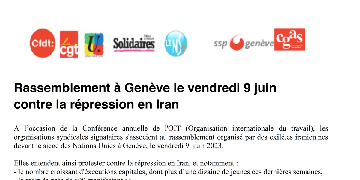 A l’occasion de la Conférence annuelle de l'OIT (Organisation internationale du travail), les organisations syndicales signataires s'associent au rassemblement organisé par des exilé.es iranien.nes devant le siège des Nations Unies à Genève, le vendredi 9 juin 2023.