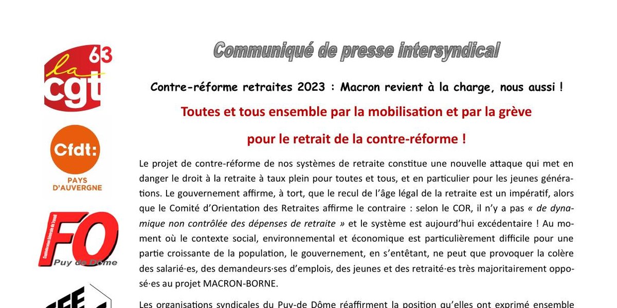 Le 12 Janvier, à la Maison du Peuple de Clermont-Ferrand, 20 représentant-e-s des organisations syndicales du Puy-de-Dome CGT, CFDT, FO, CFE-CGC, CFTC, Solidaires, FSU, UNEF et Voie Lycéenne se sont réunis pour construire localement une mobilisation qui s'inscrit dans la durée, pour gagner contre un gouvernement arc-bouté sur la volonté de nous faire toujours travailler plus longtemps.