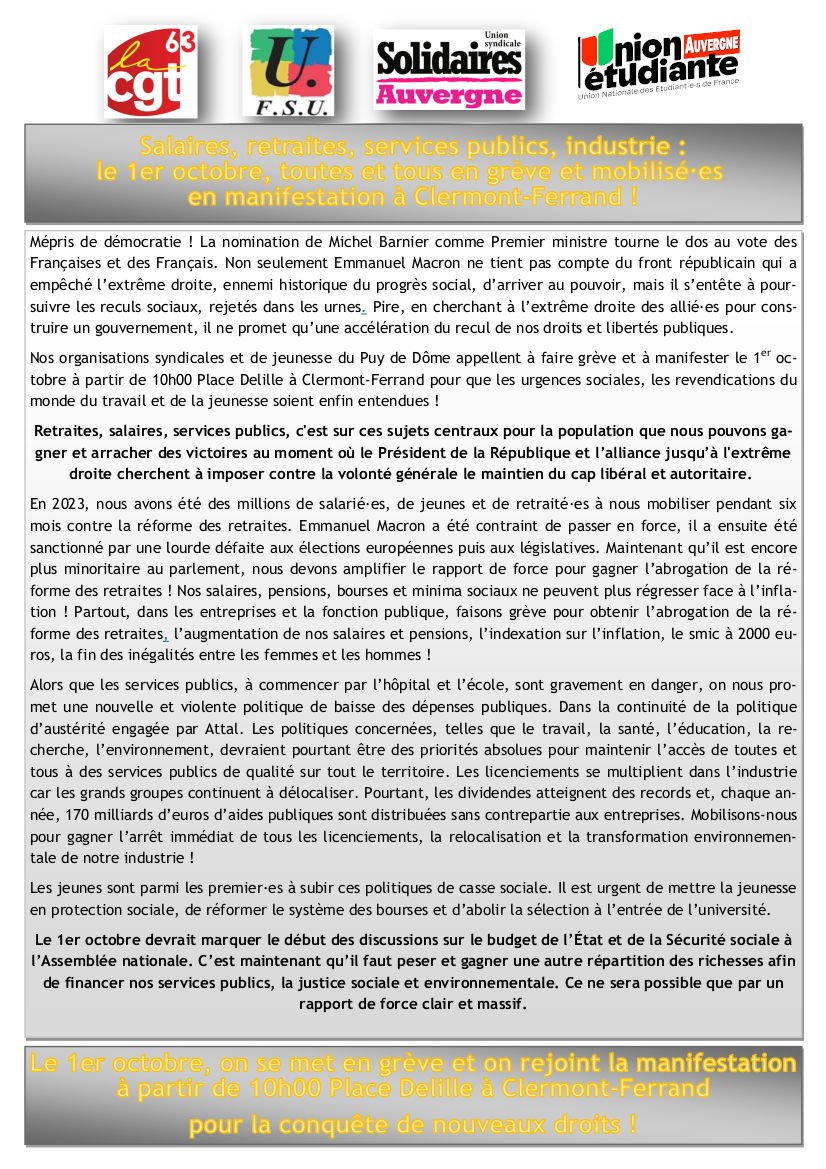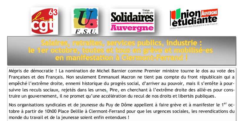 Nos organisations syndicales et de jeunesse du Puy de Dôme appellent à faire grève et à manifester le 1er octobre à partir de 10h00 Place Delille à Clermont-Ferrand pour que les urgences sociales, les revendications du monde du travail et de la jeunesse soient enfin entendues !