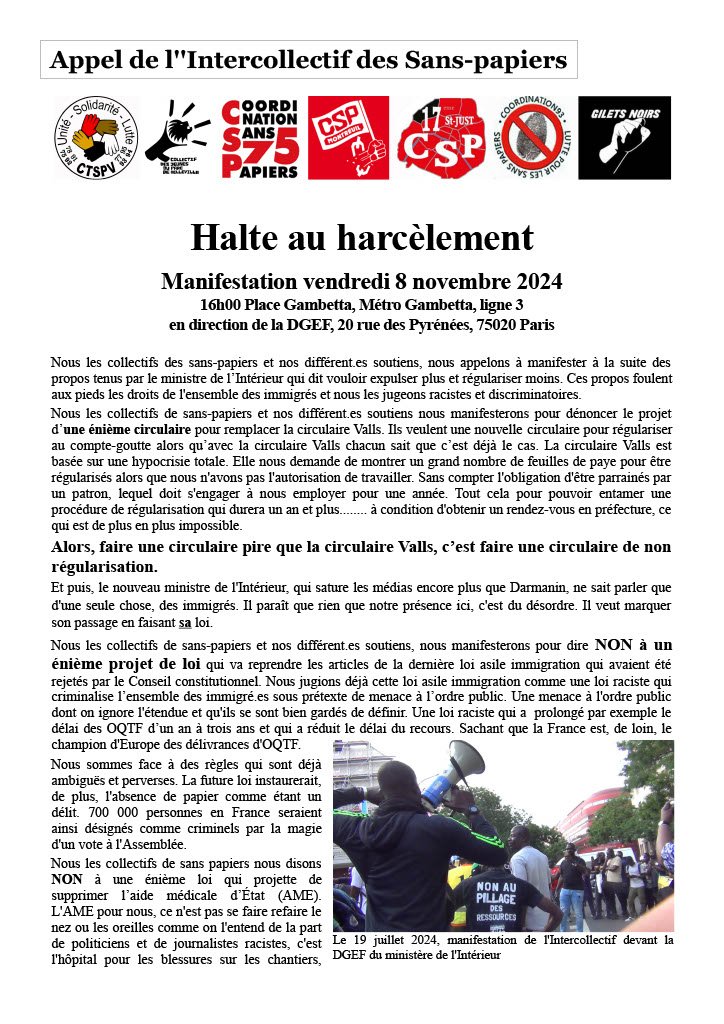 Appel de l'intercollectif des sans papiers d'Île de France : Halte au harcèlement !