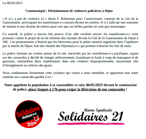 Nous appelons la population à se rassembler ce soir, 06/05/2023 devant le commissariat de police, place Suquet à 17h pour exiger la libération de nos camarades !
