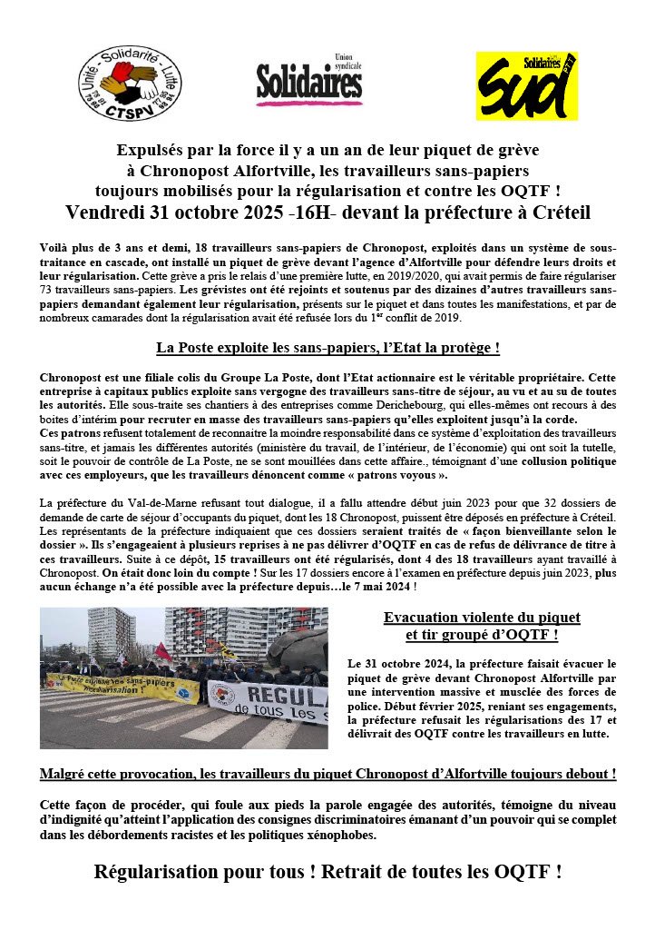 Expulsés par la force il y a un an de leur piquet de grève à Chronopost Alfortville, les travailleurs sans-papiers toujours mobilisés pour la régularisation et contre les OQTF ! Vendredi 31 octobre 2025 -16H- devant la préfecture à Créteil