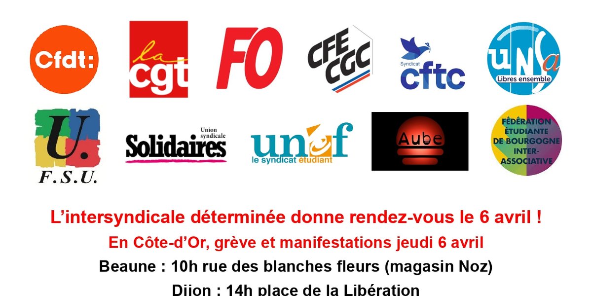 L’intersyndicale déterminée donne rendez-vous le 6 avril ! En Côte-d’Or, grève et manifestations jeudi 6 avril !