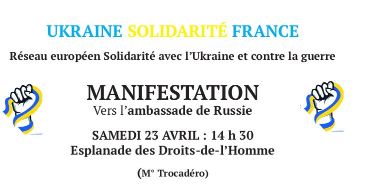 (Paris) UKRAINE SOLIDARITÉ FRANCE : MANIFESTATION SAMEDI 23 AVRIL à 14h30 (Esplanade des Droits-de-l’Homme, M° Trocadéro)