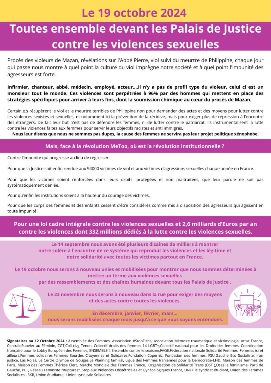 A l'appel de nombreuses associations féministes, de syndicats et de partis politiques, des rassemblements auront lieu dans toutes la France le 19 octobre à 15h.