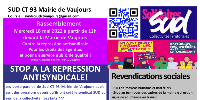 Le syndicat SUD CT 93 appelle à un rassemblement contre la répression antisyndicale que subissent les camarades de la mairie de Vaujours.