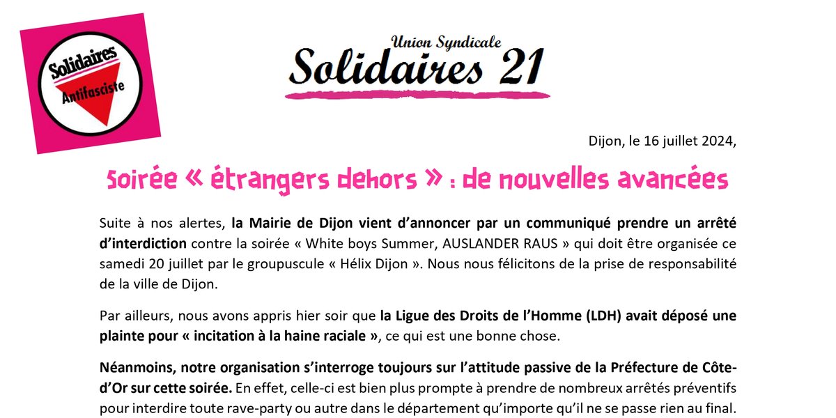 Suite à nos alertes, la Mairie de Dijon vient d’annoncer par un communiqué prendre un arrêté d’interdiction contre la soirée « White boys Summer, AUSLANDER RAUS » qui doit être organisée ce samedi 20 juillet par le groupuscule « Hélix Dijon ». Nous nous félicitons de la prise de responsabilité de la ville de Dijon.