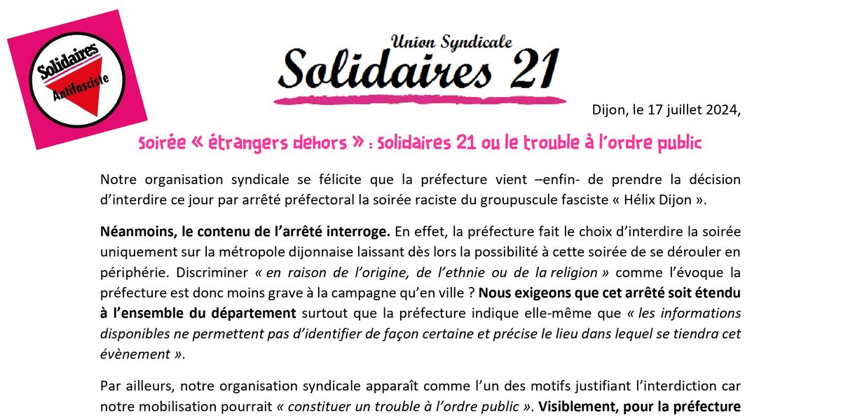Notre organisation syndicale se félicite que la préfecture vient –enfin- de prendre la décision d’interdire ce jour par arrêté préfectoral la soirée raciste du groupuscule fasciste « Hélix Dijon ».